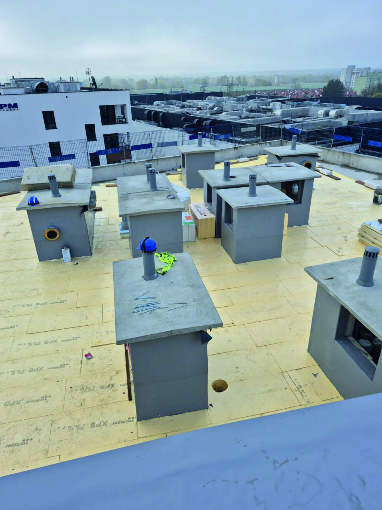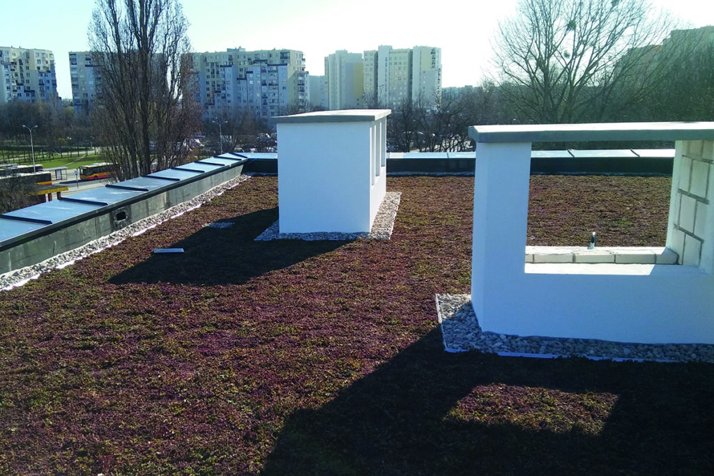 system automatycznego nawadniania, obrzeża i strefy żwirowe przy attykach, wpusty dachowe z koszami ochronnymi, bariery przeciwkorzenne w strefach drzew